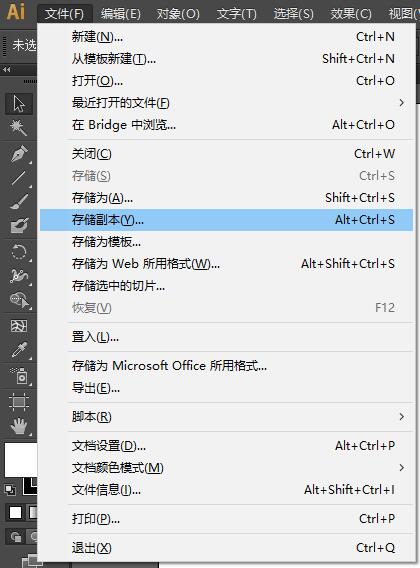 1、打开一个AI文档,单击文件菜单后,在下拉框中选择“存储副本”(选择“存储为”也可以导出PDF文档,但是有时会出现覆盖的问题)。
