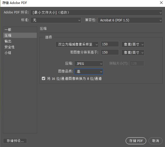 2、(可选)从“存储 Adobe PDF”对话框左边的窗格中选择“压缩”,以便指定 PDF 文件的压缩和缩减像素采样选项。